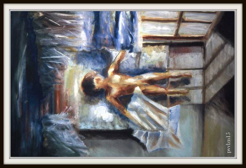 Na de verbouwing kreeg ik dit kamertje. Op zondagochtend hoorde ik de duiven koeren of als het regende het tikken op de ramen. Ik mocht geen spijkers of punaises gebruiken om iets op te hangen. Ik gebruikte draad en plakband om de kaarten van tantes en vooral Oma op te hangen. Ik kreeg hier ook op mijn 11e mijn eerste natte orgasme en op dit schilderij ben ik bezig om de natte lakens te drogen met mijn lichaamswarmte.